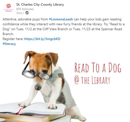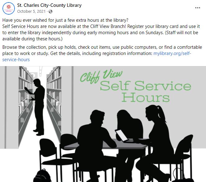 Social Media Posts These are samples of social media posts that I’ve created for the St. Charles City-County Library and The Schiele Museum of Natural History.